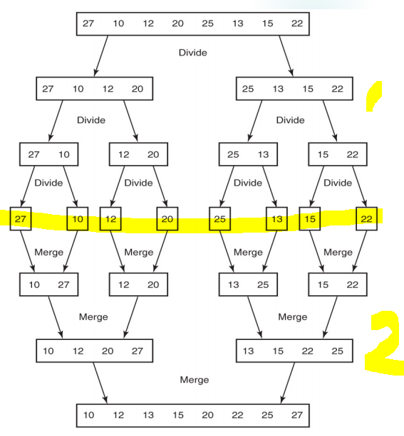 - two-way merging을 사용. 정렬된 두 배열을 하나의 배열에 합친다. 합병 과정을 반복 적용하면서 정렬된 배열을 얻는다.
