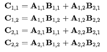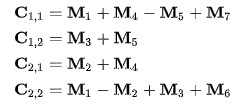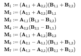 - 이 Mk 행렬들은 Ci,j 행렬을 표현하는 데 쓰이는데, 이 행렬들을 계산하는 데는 일곱 번의 곱셈(각 변수마다 한 번씩)과 10번의 덧셈이 필요하다. 이제 Ci,j 행렬은 다음과 같이 표현할 수 있다.