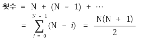 - T(n) = T(0) + T(n-1) + n+1 >> 왼쪽 서브 배열 정렬 시간 + 오른쪽 서브 배열 정렬 시간 + 나누는 시간