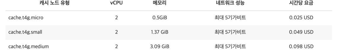 - 선결제 비용이나 장기 약정이 없으며 사용하는 각 Redis 노드에 대해 월별 비용만 지불