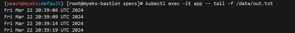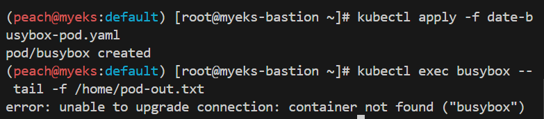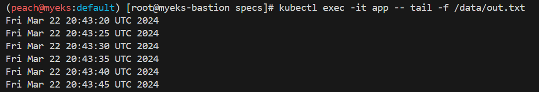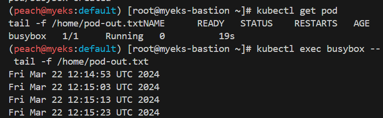 kubectl exec busybox -- tail -f /home/pod-out.txt