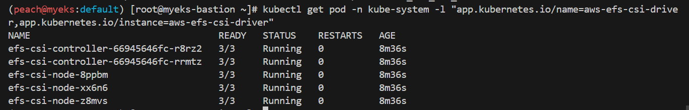 kubectl get pod -n kube-system -l "app.kubernetes.io/name=aws-efs-csi-driver,app.kubernetes.io/instance=aws-efs-csi-driver"