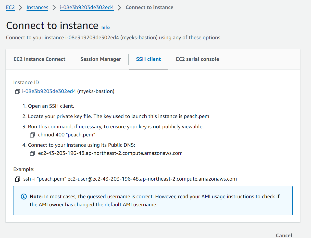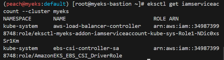 aws cloudformation deploy --template-file eks-oneclick2.yaml --stack-name myeks --parameter-overrides KeyName=<pem키 이름> SgIngressSshCidr=$(curl -s ipinfo.io/ip)/32 MyIamUserAccessKeyID=<Accesskey id> MyIamUserSecretAccessKey=<Accesskey secret> ClusterBaseName=<cluster name> --region ap-northeast-2