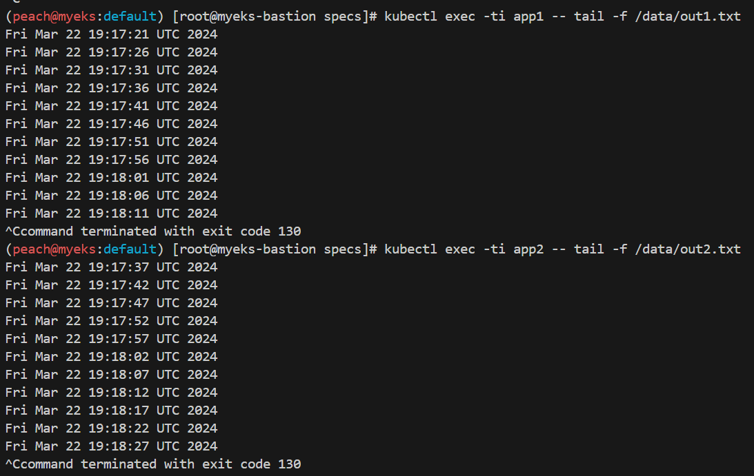 pod1 pod2에서 각각 만든 out1.txt out2.txt가 여기서도 보임~