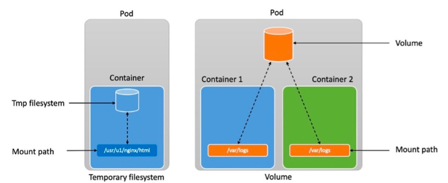 ==> 컨테이너가 공유할 별도의 저장소(storage) 필요, k8s 에서는 이 저장소를 volume.