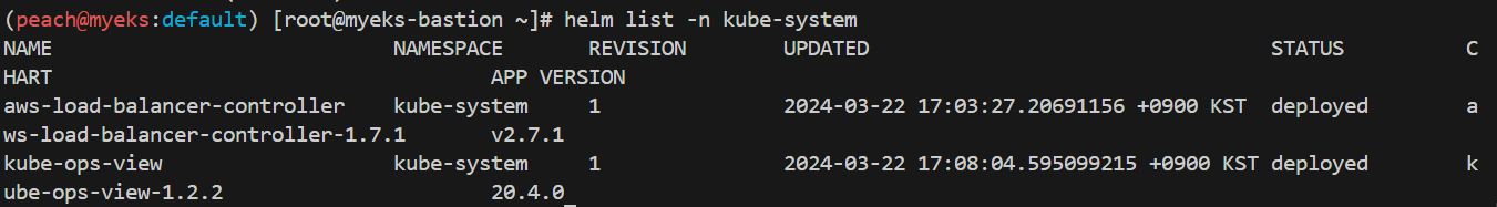 helm install kube-ops-view geek-cookbook/kube-ops-view --version 1.2.2 --set env.TZ="Asia/Seoul" --namespace kube-system