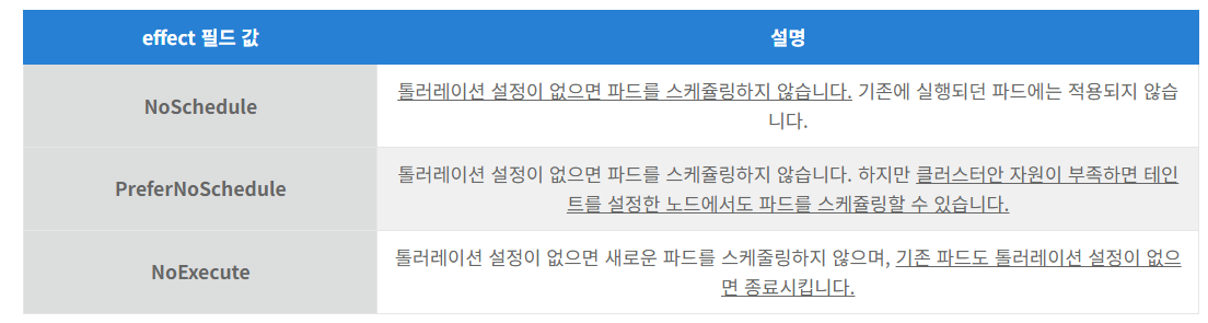 - effect 필드 값은 NoSchedule / PreferNoSchedule / NoExecute
