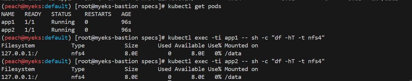 Kubernetes 클러스터 내에서 app1, app2 라는 이름의 파드에 접속하여 셸을 실행한 후, 해당 파드 내에서 df 명령을 실행하여 NFSv4(Network File System version 4) 타입의 파일 시스템을 조회