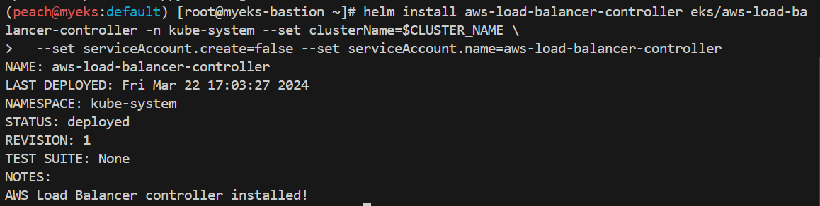 helm install aws-load-balancer-controller eks/aws-load-balancer-controller -n kube-system --set clusterName=$CLUSTER_NAME \