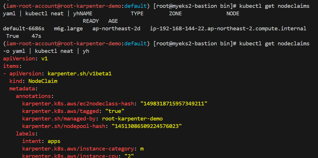 kubectl get nodeclaims -o yaml | kubectl neat | yh