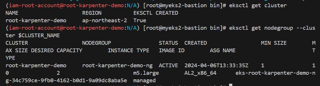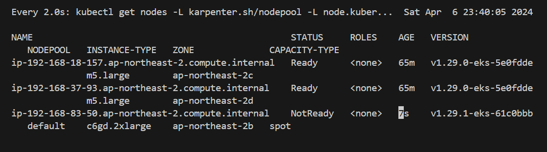 watch -d "kubectl get nodes -L karpenter.sh/nodepool -L node.kubernetes.io/instance-type -L topology.kubernetes.io/zone -L karpenter.sh/capacity-type"