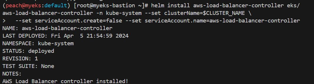 helm install aws-load-balancer-controller eks/aws-load-balancer-controller -n kube-system --set clusterName=$CLUSTER_NAME \