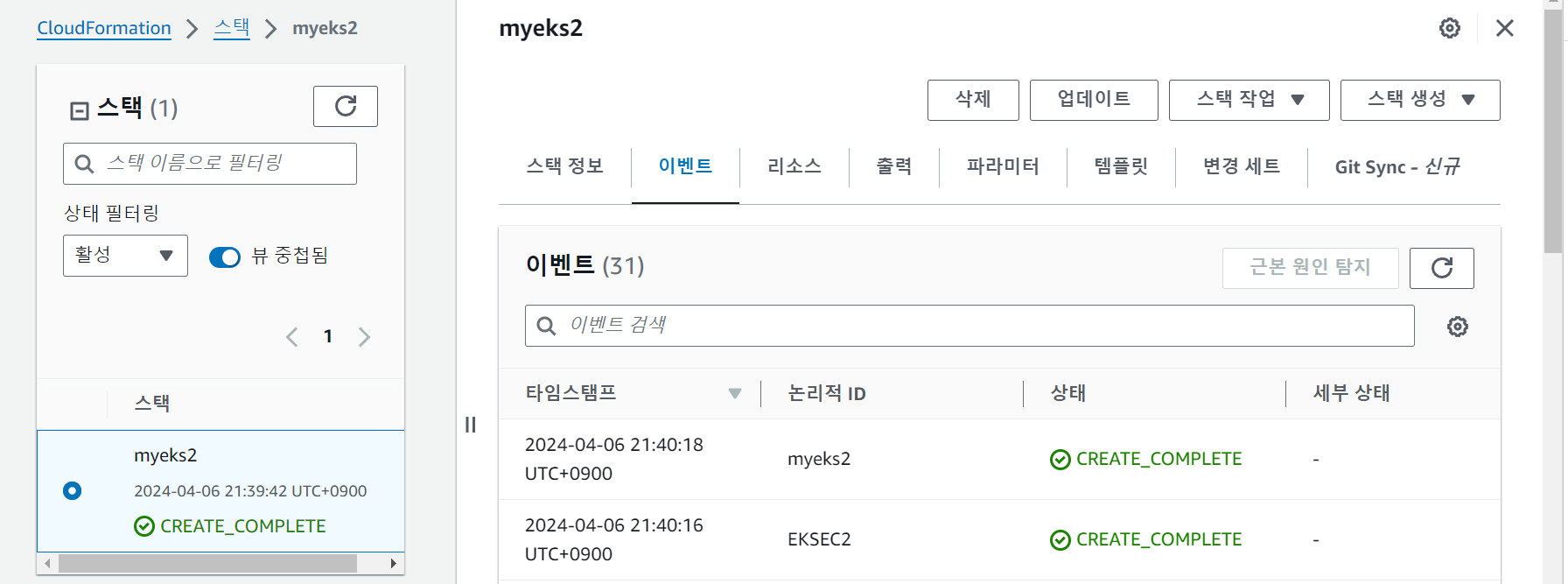 https://ap-northeast-2.console.aws.amazon.com/cloudformation/home?region=ap-northeast-2#/stacks/create?stackName=myeks&templateURL=https:%2F%2Fs3.ap-northeast-2.amazonaws.com%2Fcloudformation.cloudneta.net%2FK8S%2Feks-oneclick4.yaml