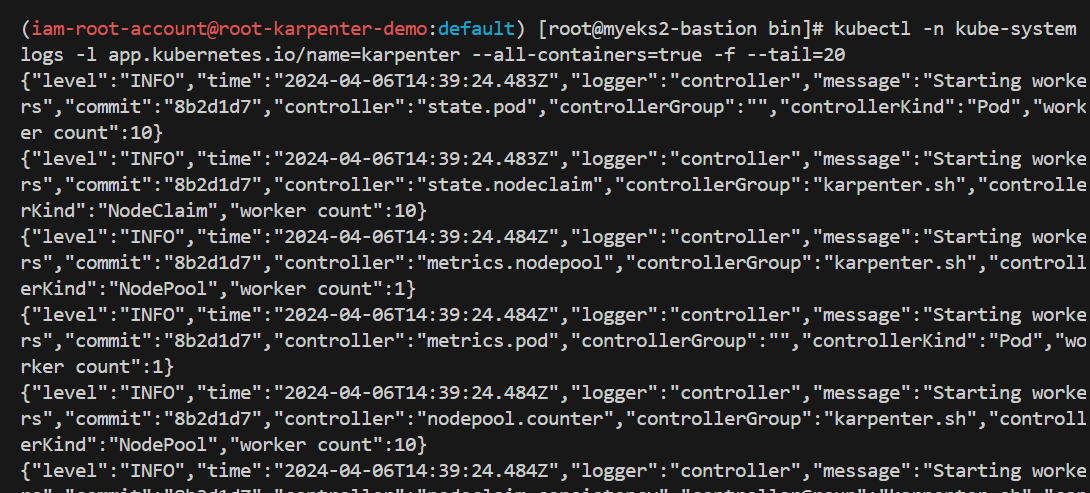 kubectl -n kube-system logs -l app.kubernetes.io/name=karpenter --all-containers=true -f --tail=20